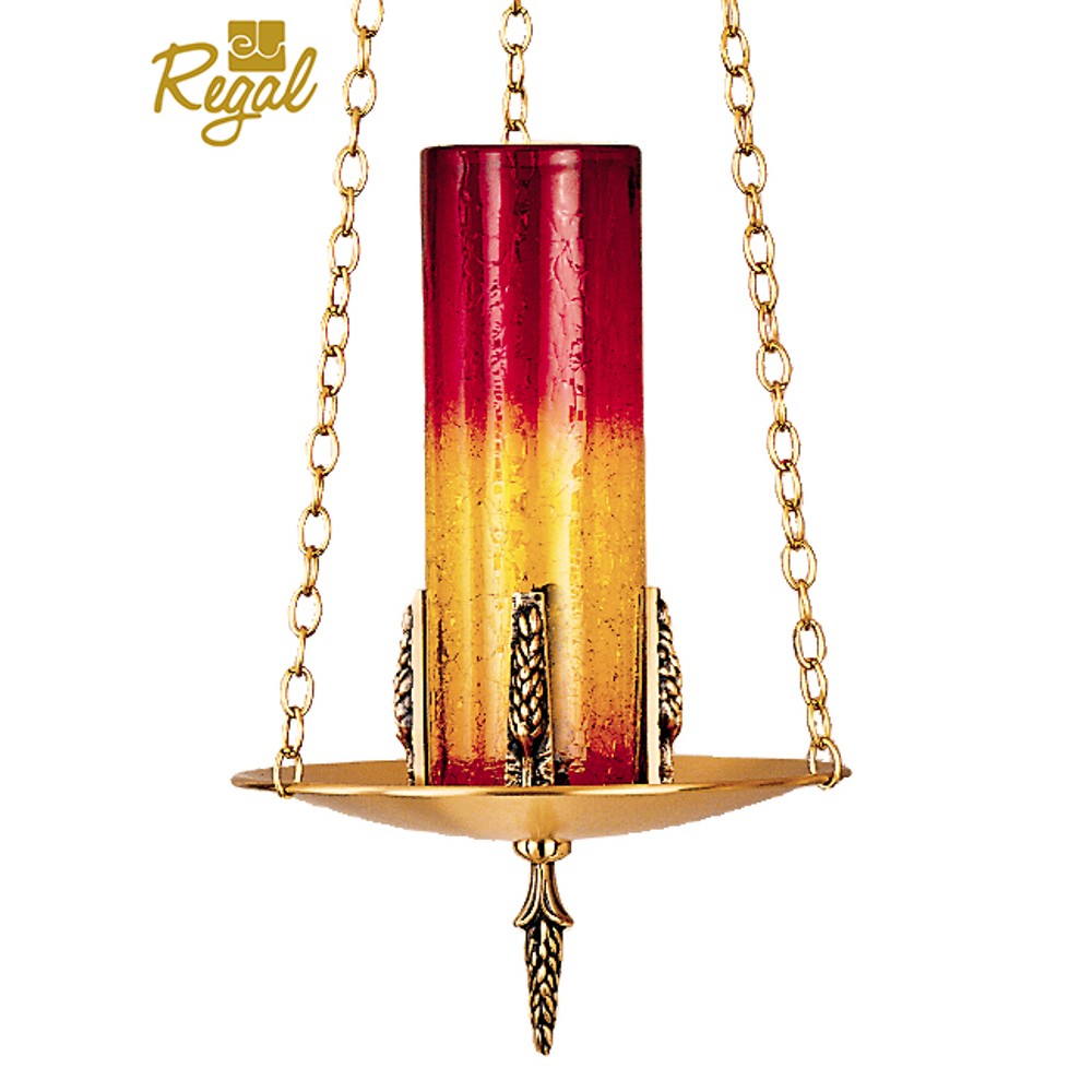 Hanging Sanctuary Lamp - Made of Brass or Bronze, to hold a 7 or 14 day candle. Includes 3 feet of chain. 11.5" Diameter. Red Glass or Red/Amber Globe is available at a additional Charge. Also available electrified at an additional charge(electrified lamps supplied with globe and 6' of cord). Click To View Mounts/Chains, Etc