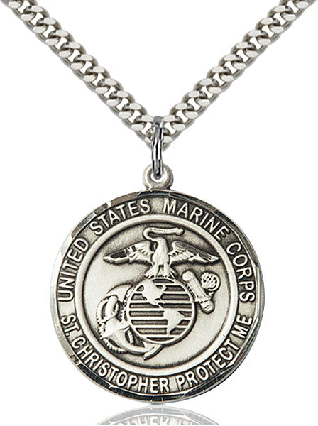 • Sterling Silver MARINES/ST. CHRISTOPHER Pendant, Stainless Silver Heavy Curb Chain