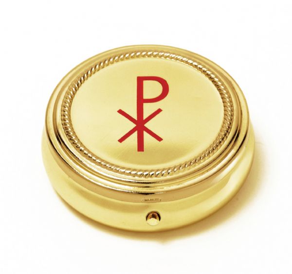 Pyx - Gold finish, 2.25" Diameter, 3/4" H. Holds 10 Hosts. Available in Chi Rho, Budded Cross, and Ichthus designs.