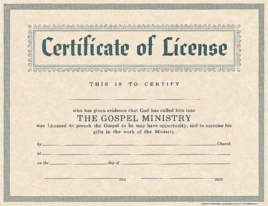 Package of 6 flat certificates (8 1/2" x 11") for minister's license printed on beige parchment paper with green ink. Space for name, church, location, date, and signatures of Clerk and Pastor.