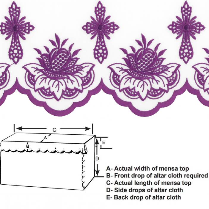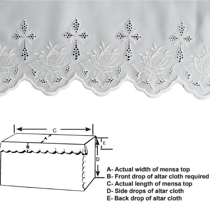 Altar Cloth made of superb quality 100% polyester with silk embroidery. These exquisite linens are hand scalloped and will give lasting elegance to any altar. These easy to maintain altar cloths for main and side altars are always custom-made.  Available in White.