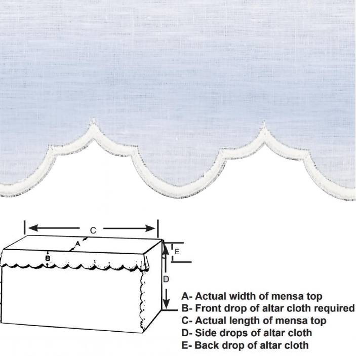 Altar Cloth made of superb quality 100% pure linen with embroidered designs of unsurpassed beauty. These exquisite linens are hand scalloped and will give lasting elegance to any altar. These easy to maintain altar cloths for main and side altars are always custom-made. Available in White. Linen is 120 thread, 4 3/4 ounce weight.