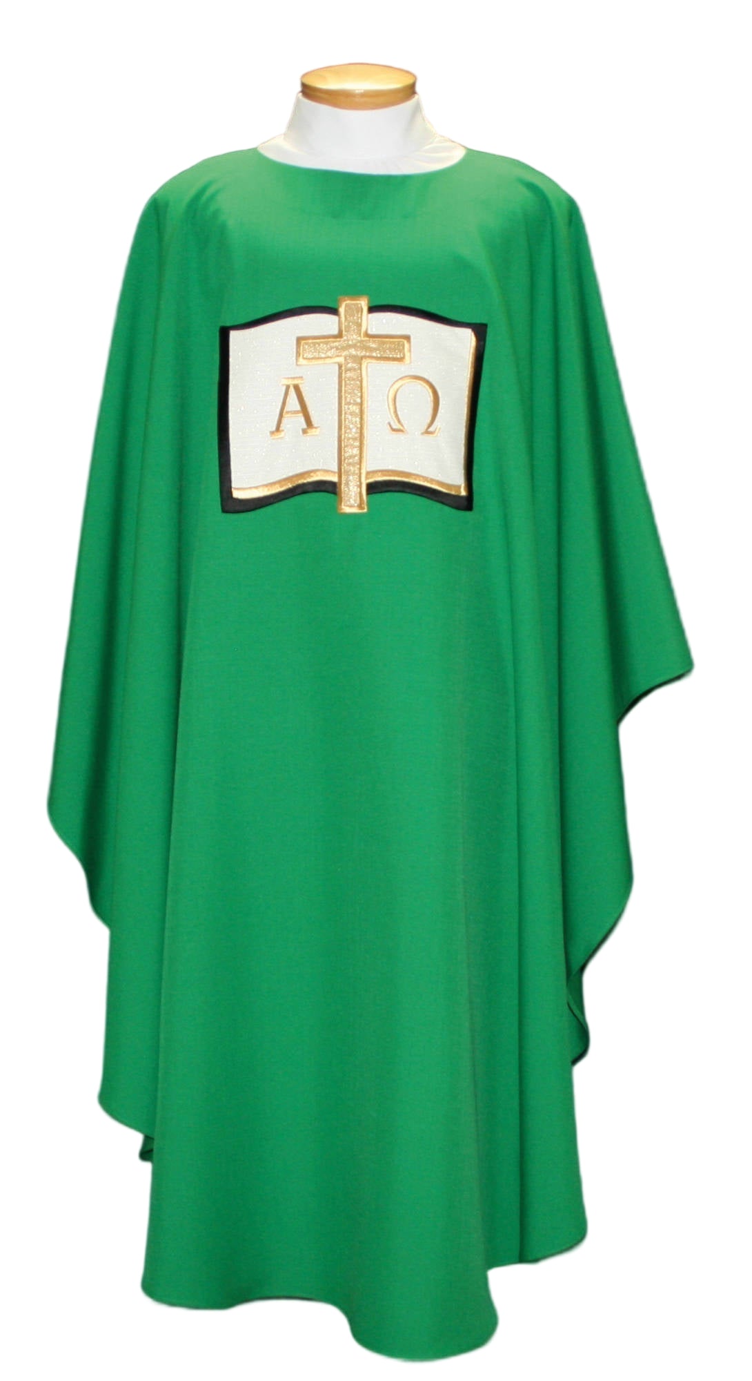 Alpha & Omega Style chasuble. This chasuble is made of polyester with a linen weave for easy care and durability. Self-Lined stole included with each chasuble.