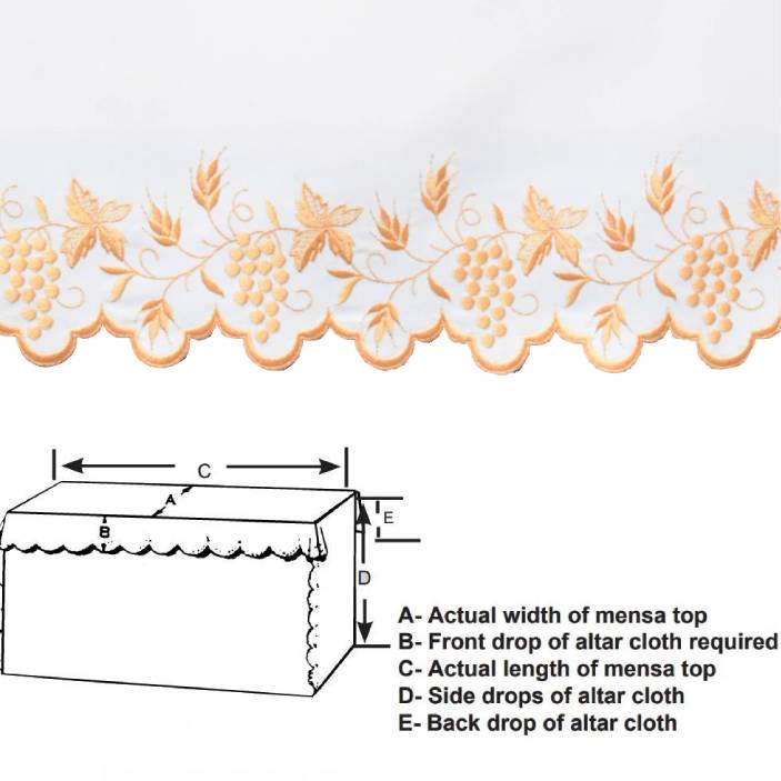 Altar Cloth made of superb quality 100% polyester with silk embroidery. These exquisite linens are hand scalloped and will give lasting elegance to any altar. These easy to maintain altar cloths for main and side altars are always custom-made.  Available in White.