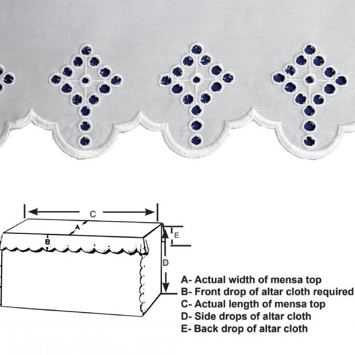 Altar Cloth made of superb quality 100% polyester with silk embroidery. These exquisite linens are hand scalloped and will give lasting elegance to any altar. These easy to maintain altar cloths for main and side altars are always custom-made. Available in White.