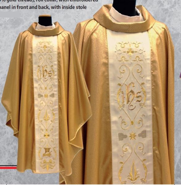 Chasuble - Made of Giotto fabric (95% pure wool, 5% gold thread), roll collar, with embroidered panel in front and back, with inside stole.