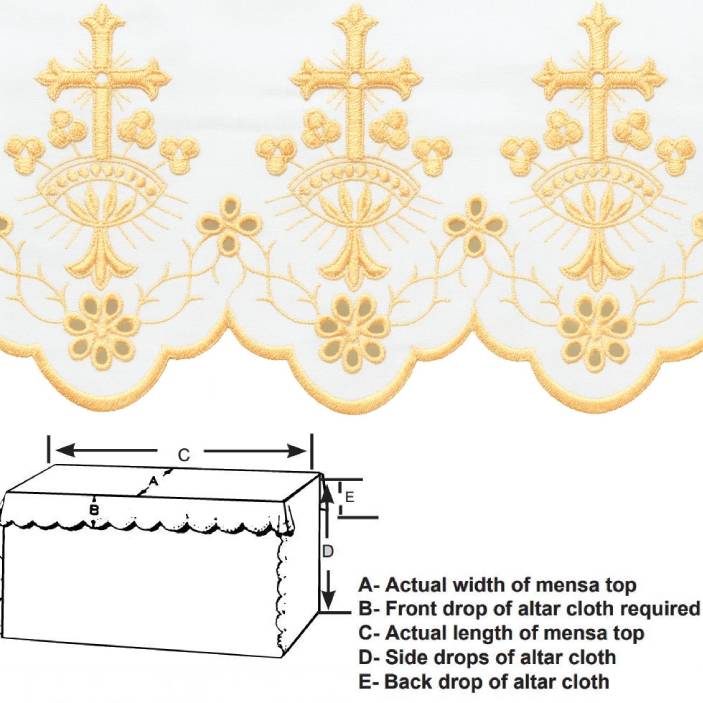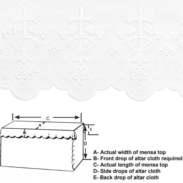 Altar Cloth made of superb quality 100% polyester with silk embroidery. These exquisite linens are hand scalloped and will give lasting elegance to any altar. These easy to maintain altar cloths for main and side altars are always custom-made. Available in White.