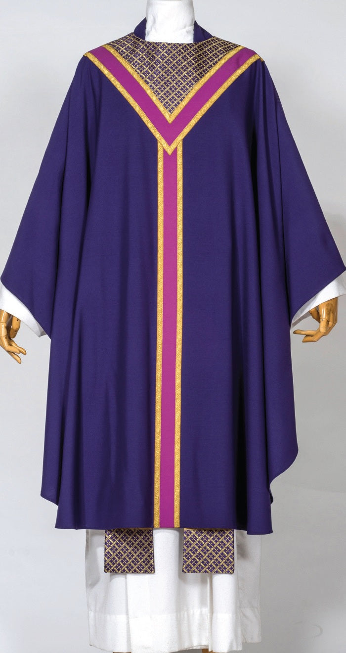 The chasuble has a gothic cut with 61 inch width and 49 inch length and includes an inner stole.