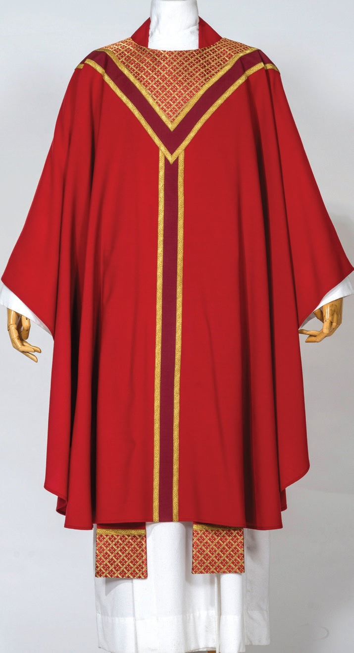 The chasuble has a gothic cut with 61 inch width and 49 inch length and includes an inner stole.