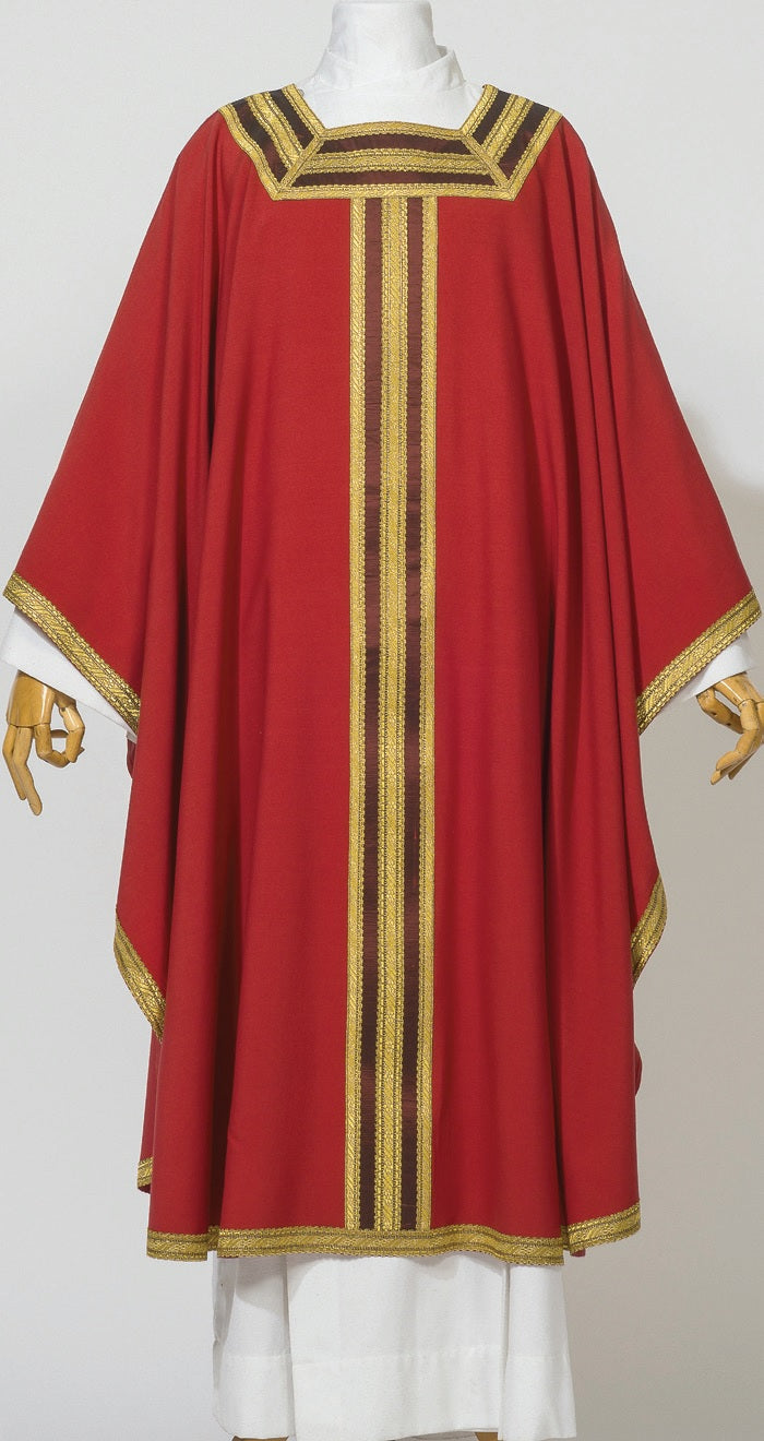 The chasuble has a gothic cut with 61 inch width and 53 inch length and includes an inner stole.