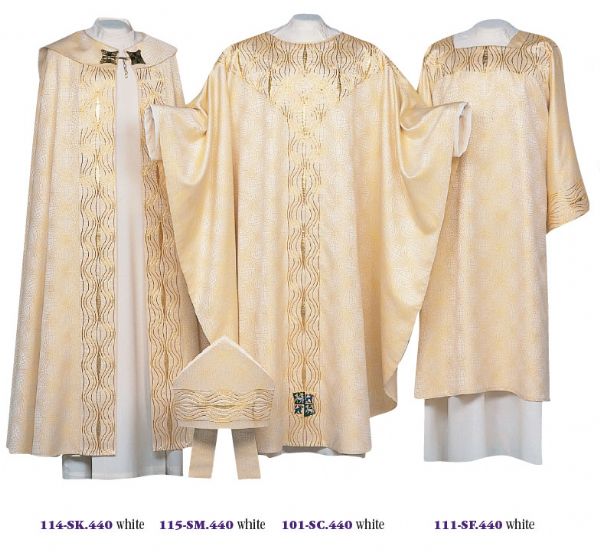 The chasubles have a Gothic cut with a 61" width and 53" length and include an inner stole.