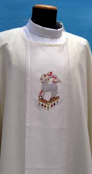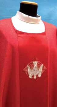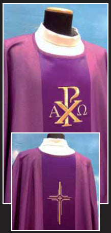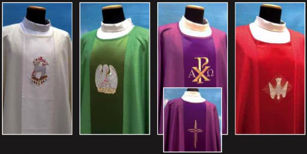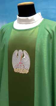 Chasubles in Assisi Fabric (90% polyester, 10% gold thread) with embroidered panel in front and back. With inside stole.