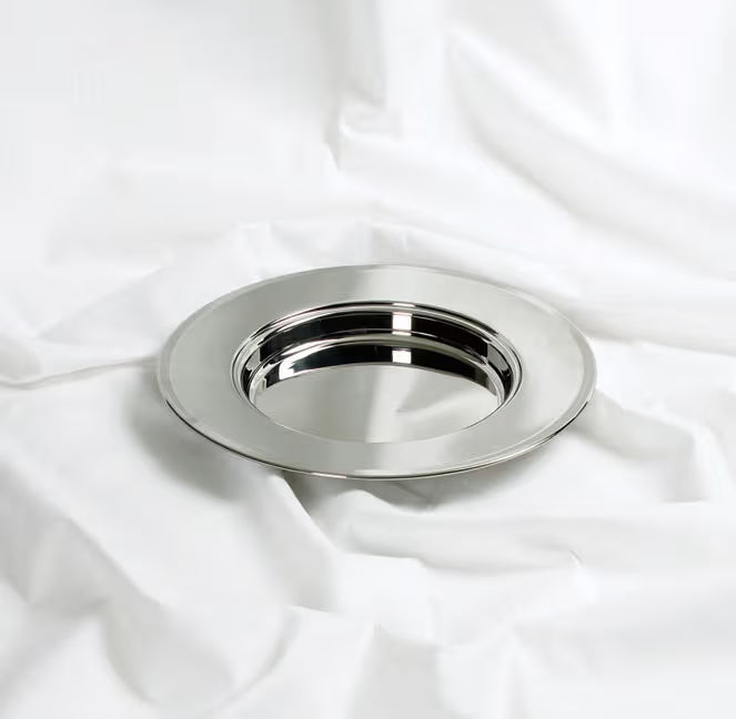 Communion Bread Plate with a Silver Finish & made with high quality stainless steel. Holds Up To 500 Pieces of Communion Bread. It achieves it's beautiful silver shine through a polishing process.  The Communion Bread Plate is used for serving bread where a small number of plates are needed. The Communion Bread Plate is standard size (1 1/8" high and has a diameter of 10 1/8"). It has a smooth, flat rim for passing from one hand to another. The edges are double rounded to ensure a smooth and safe feel to this piece. Our pieces are easily cleaned with mild soap and water and a soft cloth.