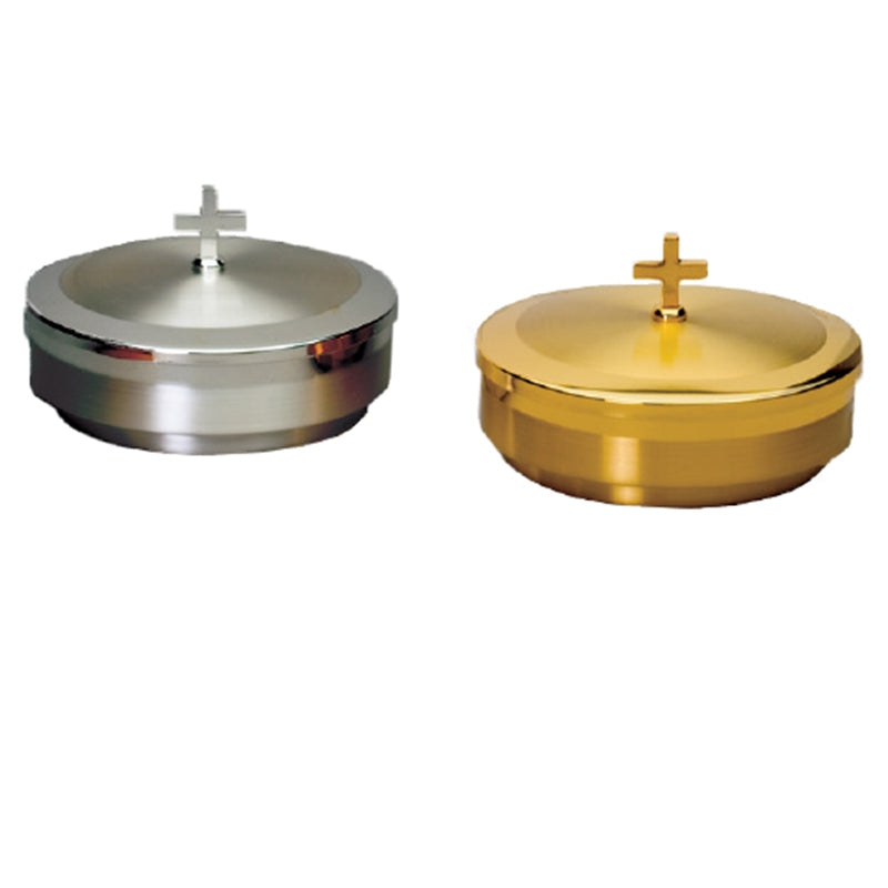 Bread Box is 3" high, 5" in diameter. Capacity 185 Hosts. All metal construction, all 24kt gold plate, combination satin and high polish finish.