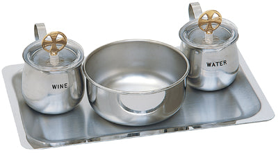 Stainless Steel Cruet Set - Includes a 4 ¼" bowl, 61/2" x 10" Stainless Steel Tray & 5oz Stainless Steel Cruets with gold plated cross on a clear cover.