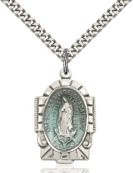 - Sterling Silver O/L of Guadalupe Blue Epoxy Pendan, Stainless Silver Heavy Curb Chain