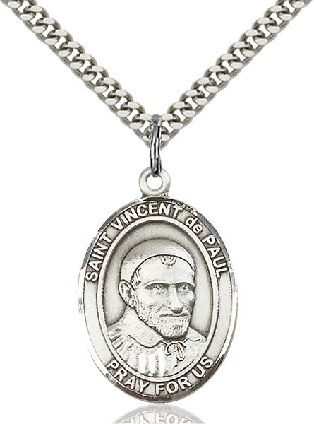 • Sterling Silver St. Vincent de Paul Pendant, Stainless Silver Heavy Curb Chain