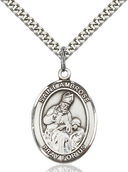 - Sterling Silver St. Ambrose Pendant, Stainless Silver Heavy Curb Chain