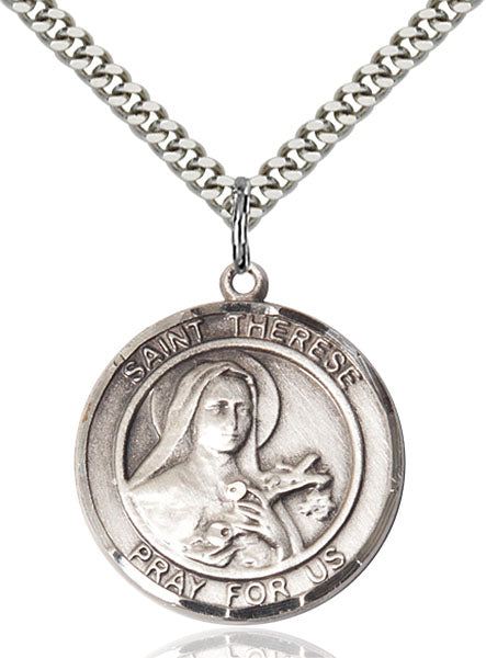 - Sterling Silver St. Therese of Lisieux Pendant, Stainless Silver Heavy Curb Chain