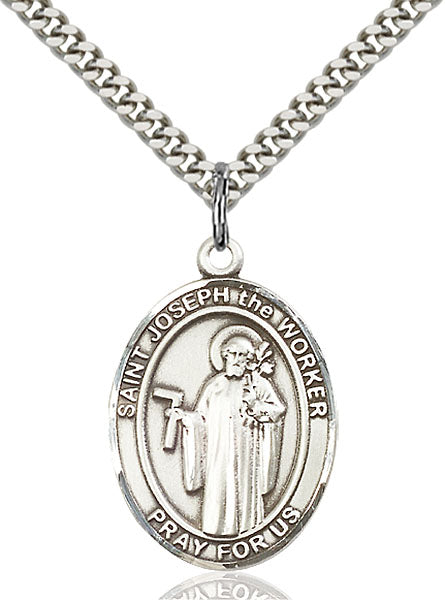 • Sterling Silver St. Joseph The Worker Pendant, Stainless Silver Heavy Curb Chain