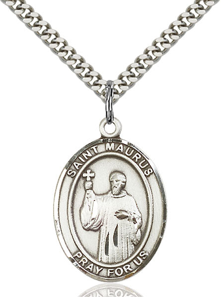 - Sterling Silver St. Maurus Pendant, Stainless Silver Heavy Curb Chain
