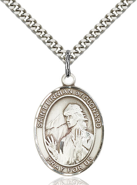 • Sterling Silver St. Finnian of Clonard Pendant, Stainless Silver Heavy Curb Chain