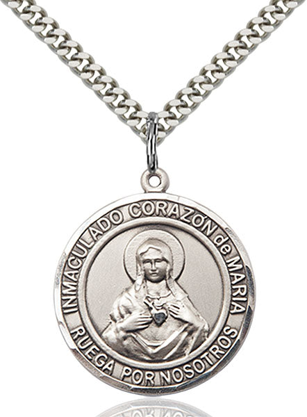 • Sterling Silver Corazon Inmaculado De Maria Pendant, Stainless Silver Heavy Curb Chain