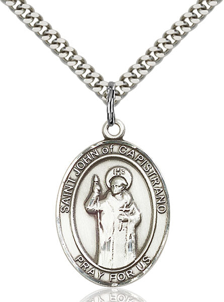 • Sterling Silver St. John of Capistrano Pendant, Stainless Silver Heavy Curb Chain
