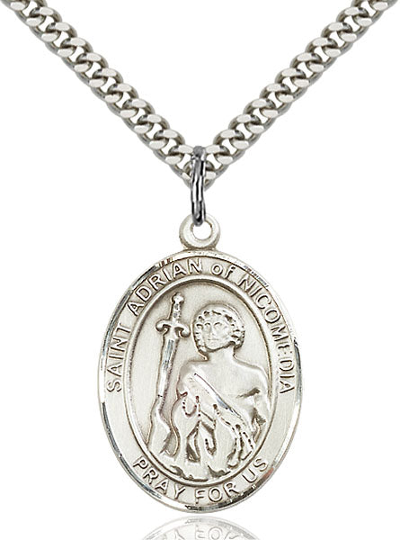 • Sterling Silver St. Adrian of Nicomedia Pendant, Stainless Silver Heavy Curb Chain
