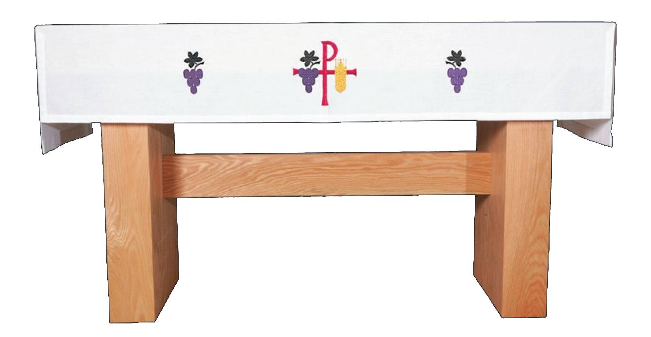 Design available on all white, blue, green, purple, or oyster cloth. Fabric is a blend of 50% rayon and 50% polyester. Maximum width of altar is 48". Please call to order!