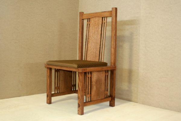 Our Arts & Crafts style furnishings are inspired by the rectillinear elements typical of the Arts & Crafts Movement of the late nineteenth and early twentieth century in America. These furnishings reveal the natural beauty of the wood and the intricate details of the joinery and construction. The craftsmanship of our skilled artisans is captured and reflected in all of our Arts & Crafts furnishings. Presiders Chair constructed from Red Oak solids and veneers. Medium Oak color and conversion varnish finish. Also available in Cherry solids and veneers. Sold as part of a set. Parts sold individually. See links below for more pieces.