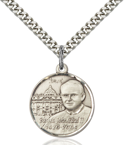 - Sterling Silver St. John Paul II Pendant, Stainless Silver Heavy Curb Chain