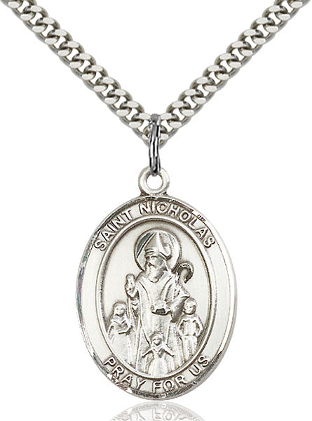 - Sterling Silver St. Nicholas Pendant, Stainless Silver Heavy Curb Chain