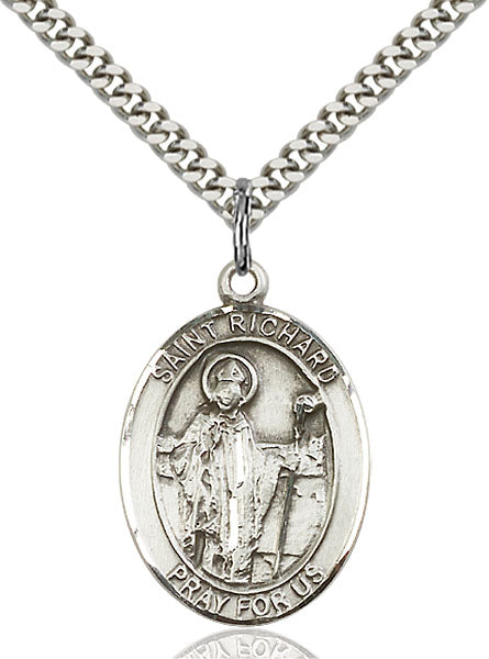 - Sterling Silver St. Richard Pendant, Stainless Silver Heavy Curb Chain