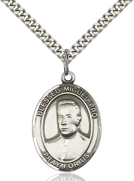 - Sterling Silver Blessed Miguel Pro Pendant, Stainless Silver Heavy Curb Chain