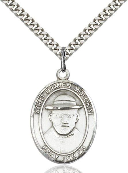- Sterling Silver St. Damien of Molokai Pendant, Stainless Silver Heavy Curb Chain