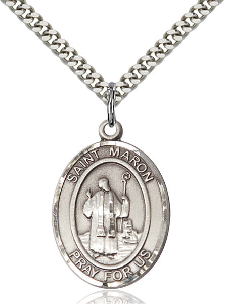 - Sterling Silver St. Maron Pendant, Stainless Silver Heavy Curb Chain