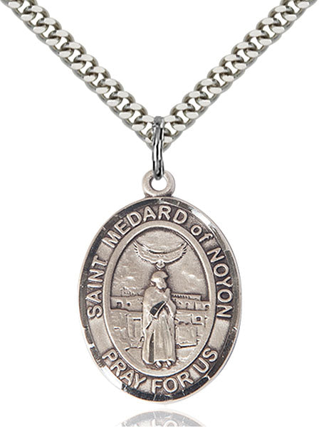 • Sterling Silver St. Medard of Noyon Pendant, Stainless Silver Heavy Curb Chain