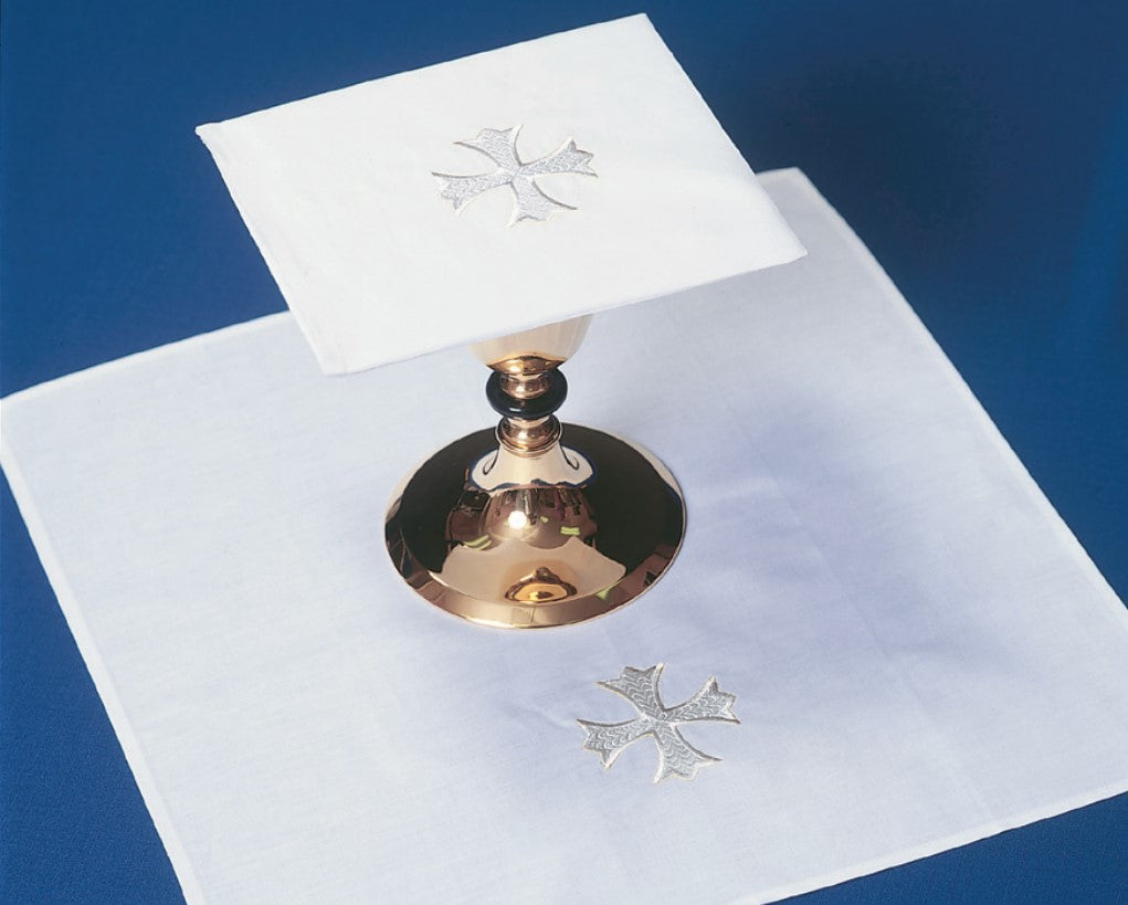 Complete gift set of washable sacramental linens in Blended linen, a fabric of 53% linen and 47% cotton. The gift box contains a purificator , a finger towel(plain) , a chalice pall and a corporal . A 3" Greek Cross is embroidered on the purificator, the chalice pall and the corporal.