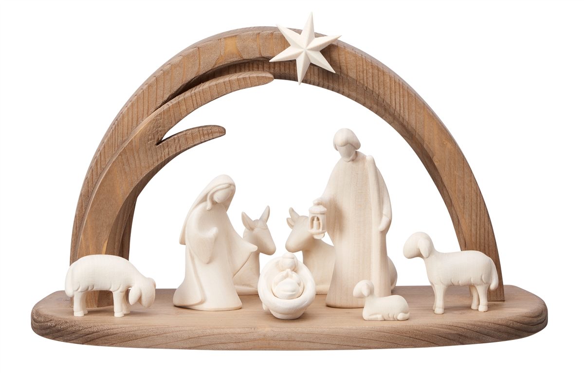 The Leonardo nativity scene belongs to the category of modern Christmas cribs, characterized by its refined and minimalist style. The elegant figures, skillfully carved from premium mountain maple wood, are available in both natural and colored finishes. The meticulous painting of these sculptures, using high-quality oil colors, showcases the wood's natural grain with exquisite delicacy and care.