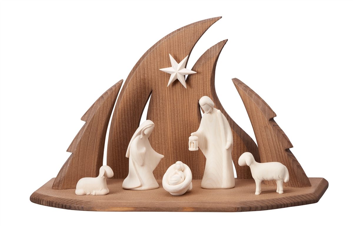 The Leonardo nativity scene belongs to the category of modern Christmas cribs, characterized by its refined and minimalist style. The elegant figures, skillfully carved from premium mountain maple wood, are available in both natural and colored finishes. The meticulous painting of these sculptures, using high-quality oil colors, showcases the wood's natural grain with exquisite delicacy and care.