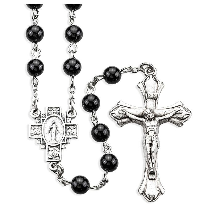 Our premium handcrafted rosaries are some of the finest in the industry. High-quality beads with a deluxe crucifix and center at affordable prices. Our 6 mm Genuine Onyx Stone Round Bead Rosary comes with our deluxe silver oxidized crucifix and unique 'Mary' center. Our rosaries make great gifts for any occasion, or use them as favors for your next Baptism, Christening, Communion, Confirmation, Wedding, Anniversary, Birthday, Easter, or Christmas.