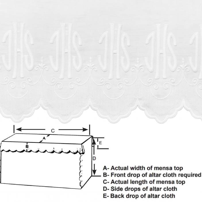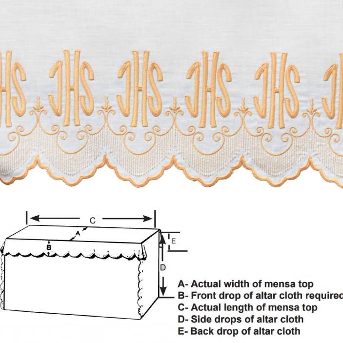 Altar Cloth made of superb quality 100% pure linen with embroidered designs of unsurpassed beauty. These exquisite linens are hand scalloped and will give lasting elegance to any altar. These easy to maintain altar cloths for main and side altars are always custom-made. Available in White. Linen is 120 thread, 4 3/4 ounce weight.