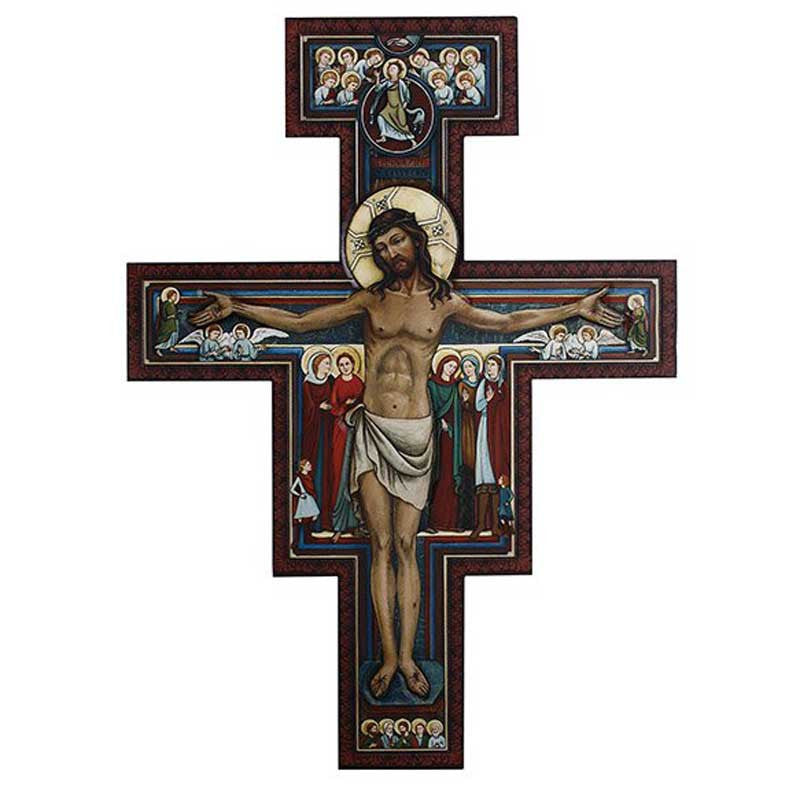 The illustrative imagery on the San Damiano Cross has been used for centuries to teach the Crucifixion of Christ. It holds much meaning for Catholics as Saint Francis knelt before it to pray and received his instructions from God to rebuild the Church. Franciscans treasure this descriptive cross as a symbol of their mission from God.