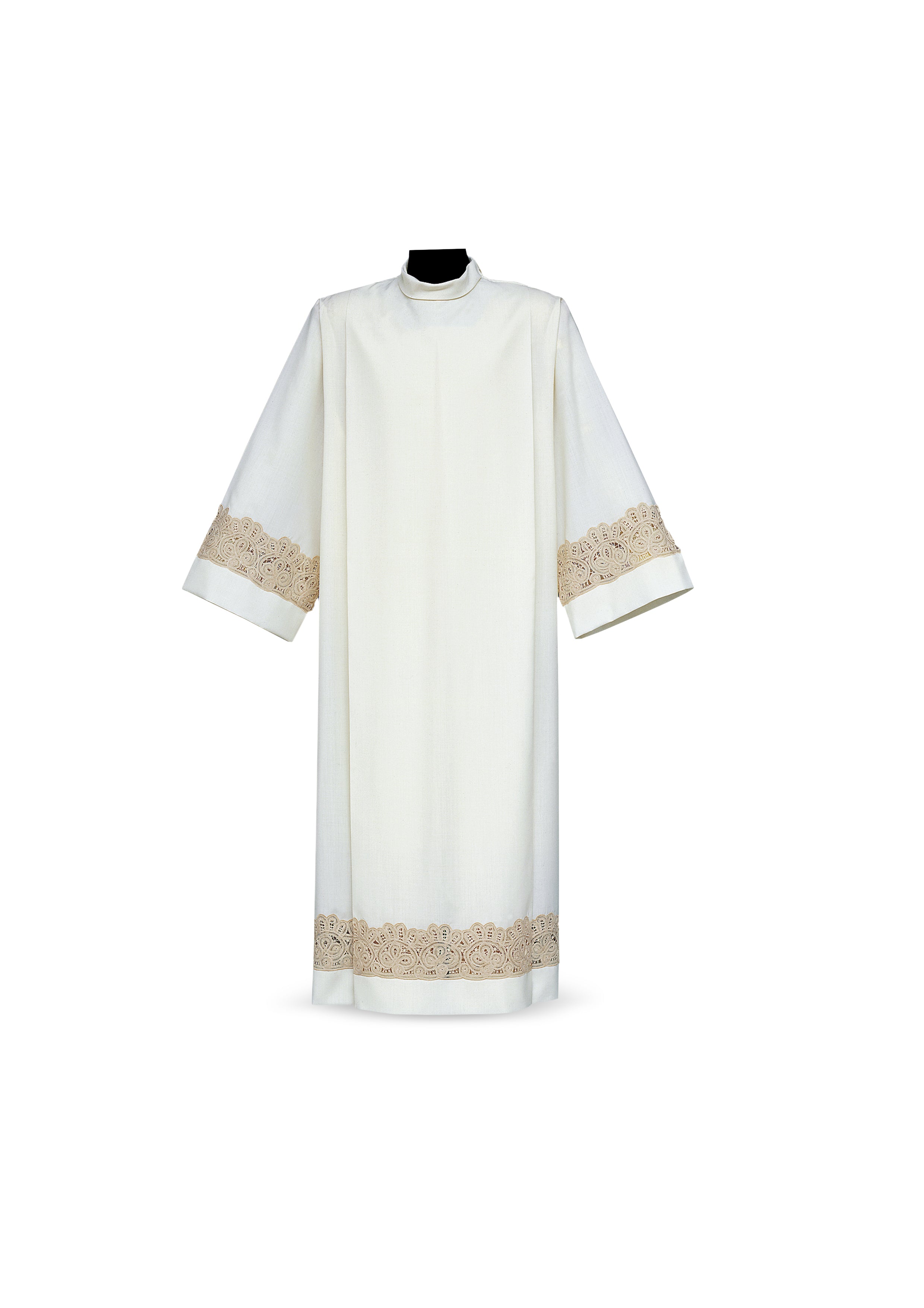 Alb with wrap front and back, with lace inserts in gold on sleeves and bottom. Made in Italy.