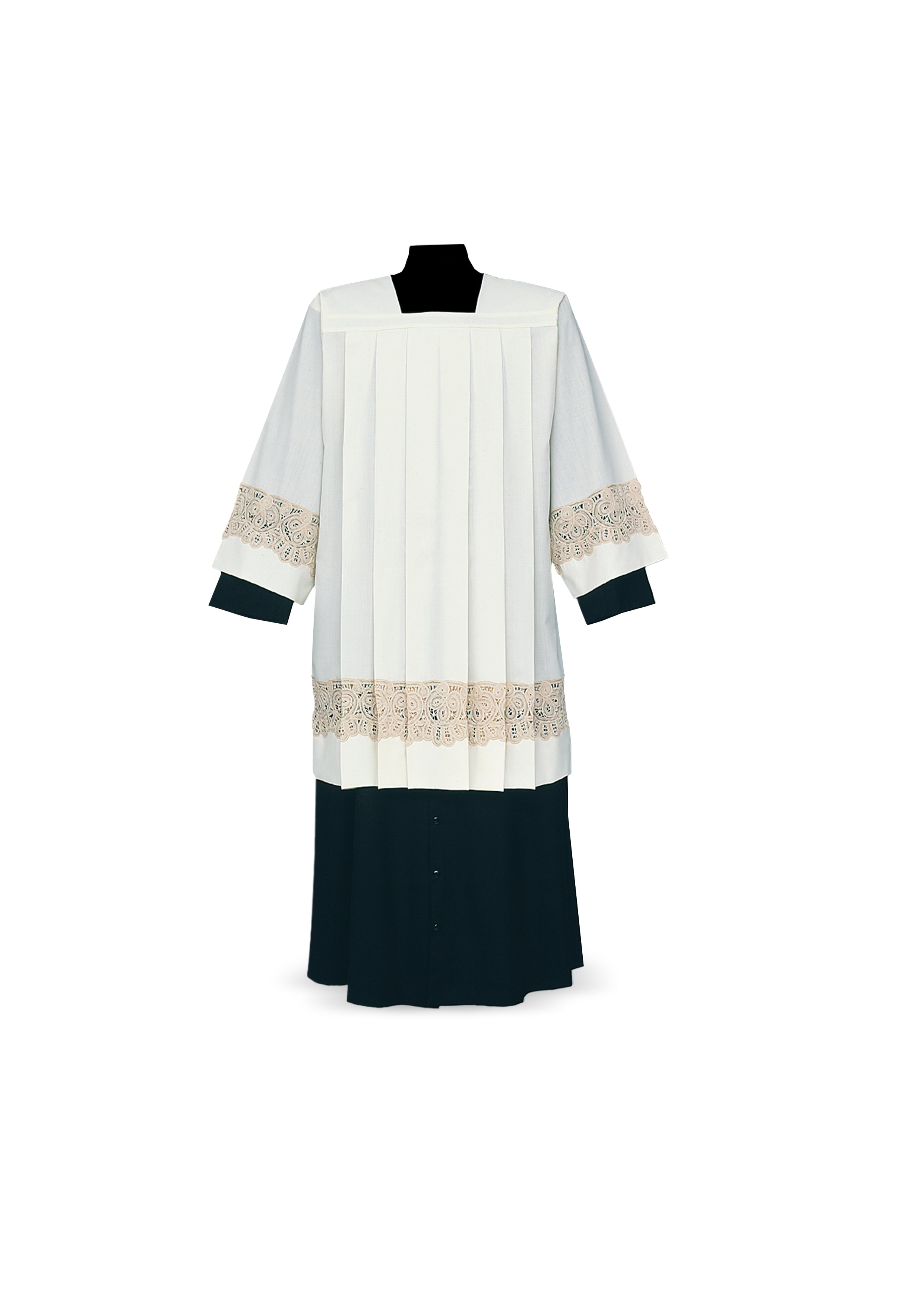 Traditional square neck surplice with lace inserts in gold on sleeves and bottom, with pleats. Made in Italy.
