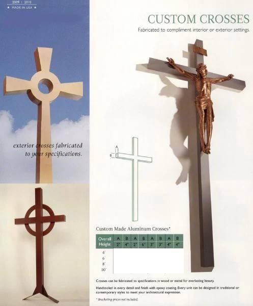 Crosses can be fabricated to specifications in wood or metal for everlasting beauty. Handtooled in every detail and finish with epoxy coating. Every unit can be designed in traditional or contemporary styles to meet your architectural expression. Contemporary designs engineered and fabricated in stainless steel. Please Call To Order.