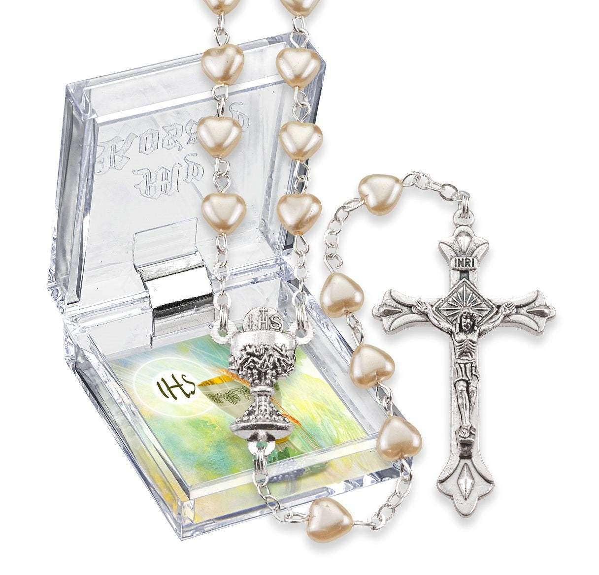 Cream Pearlized Heart Shaped Glass Bead Communion Rosary, Boxed>5mm Heart Shaped Cream Pearlized Glass Bead Rosary.