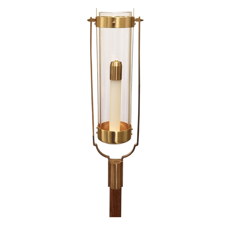 Processional swinging torch with oil candle shell. Available with clear or ruby glass. Measures 56" in height with a 7/8" socket.