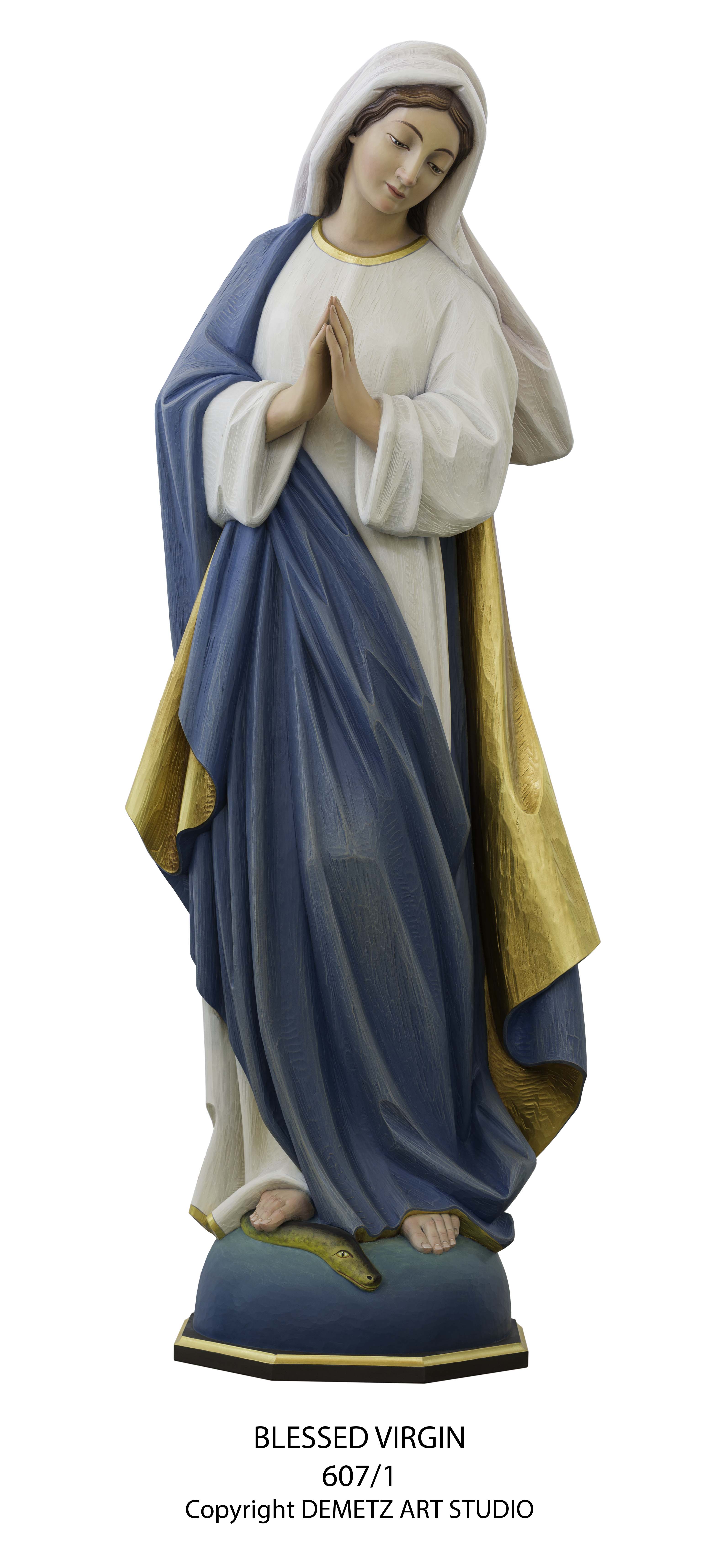 607-1 - WOOD CARVED BLESSED VIRGIN STATUE - From Demetz Art Studio in Italy Hand Carved in Linden Wood, full round figure. Available in multiple sizes and in fiberglass.